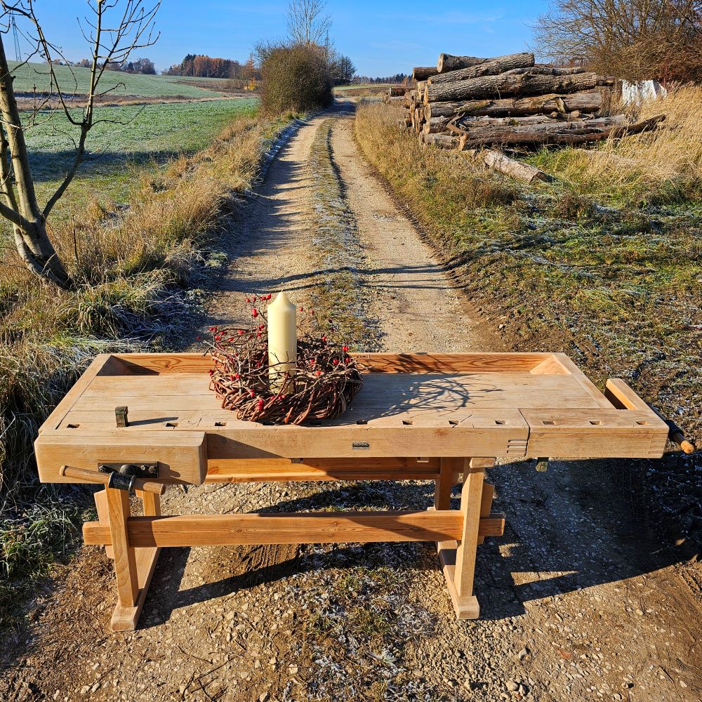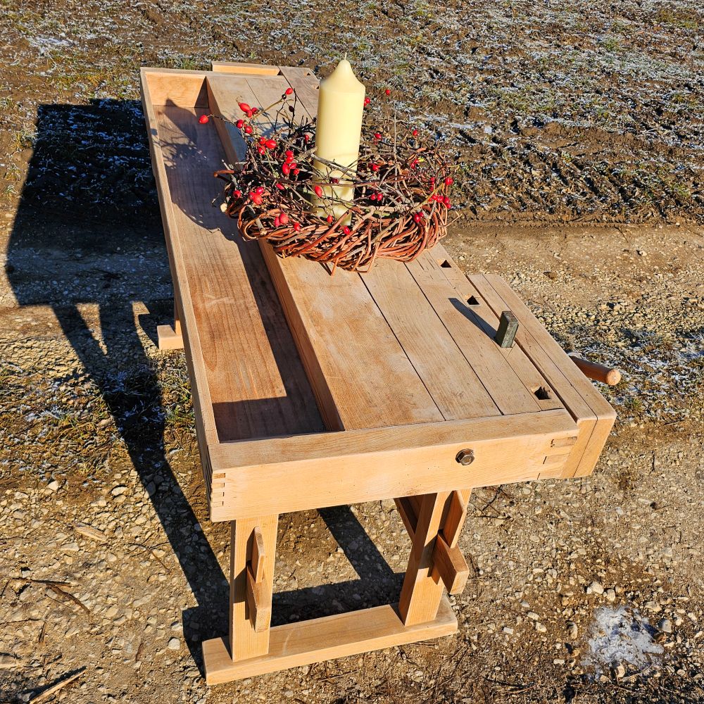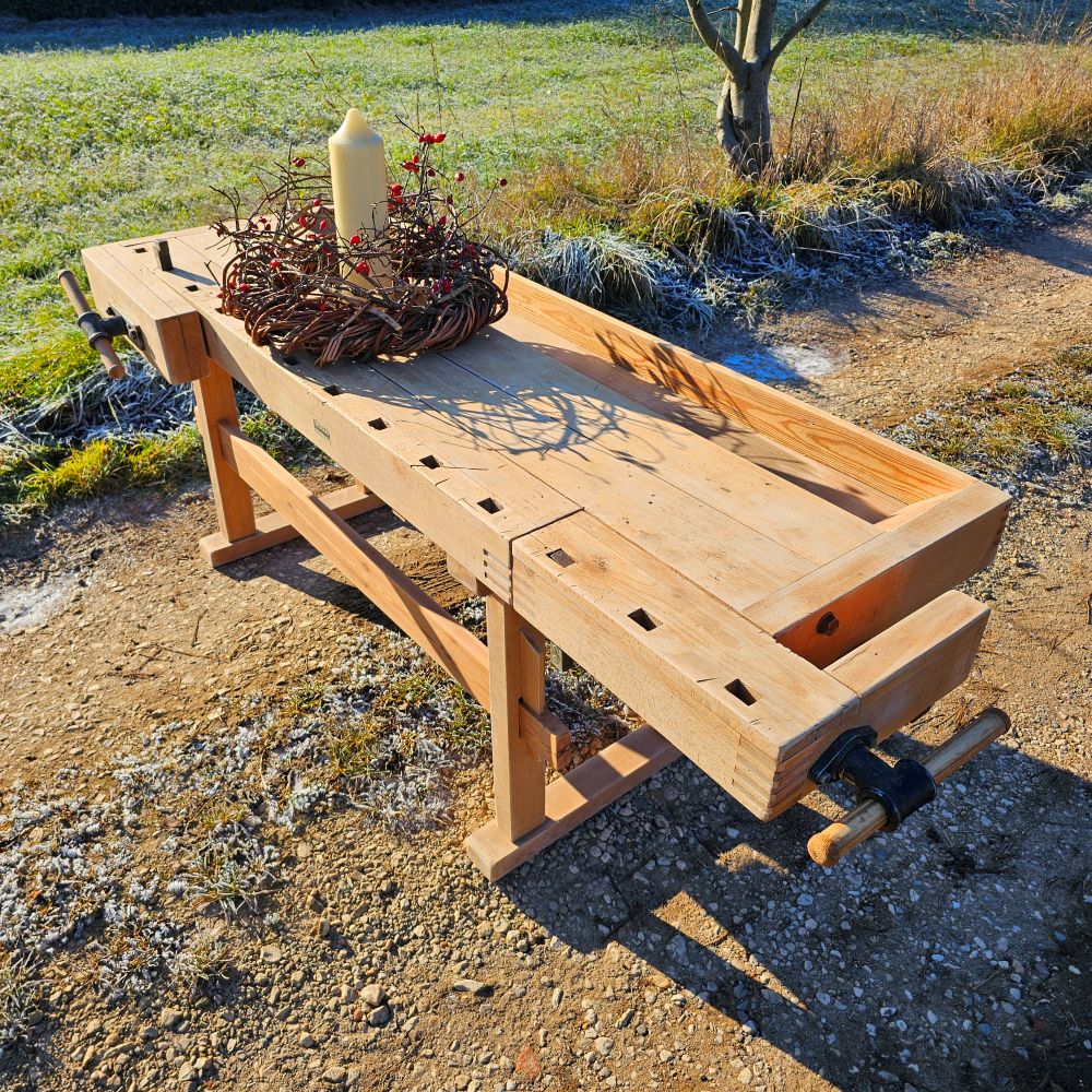 Behutsam aufgearbeitet: Holzoberflächen gereinigt und gefestigt, beide Schraubstöcke geprüft, Gestell stabilisiert. Authentische Gebrauchsspuren bleiben bewusst erhalten – sie machen den Charakter aus.