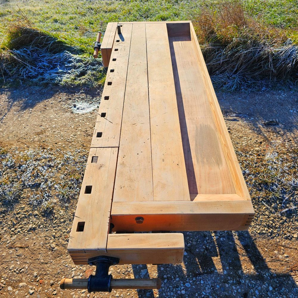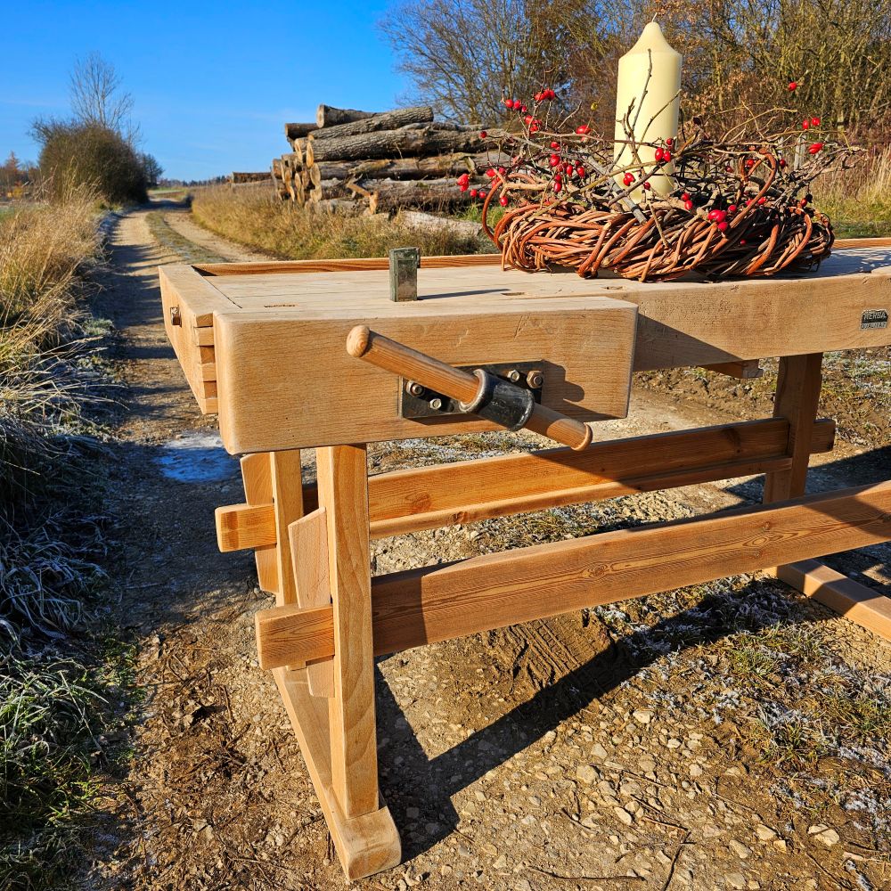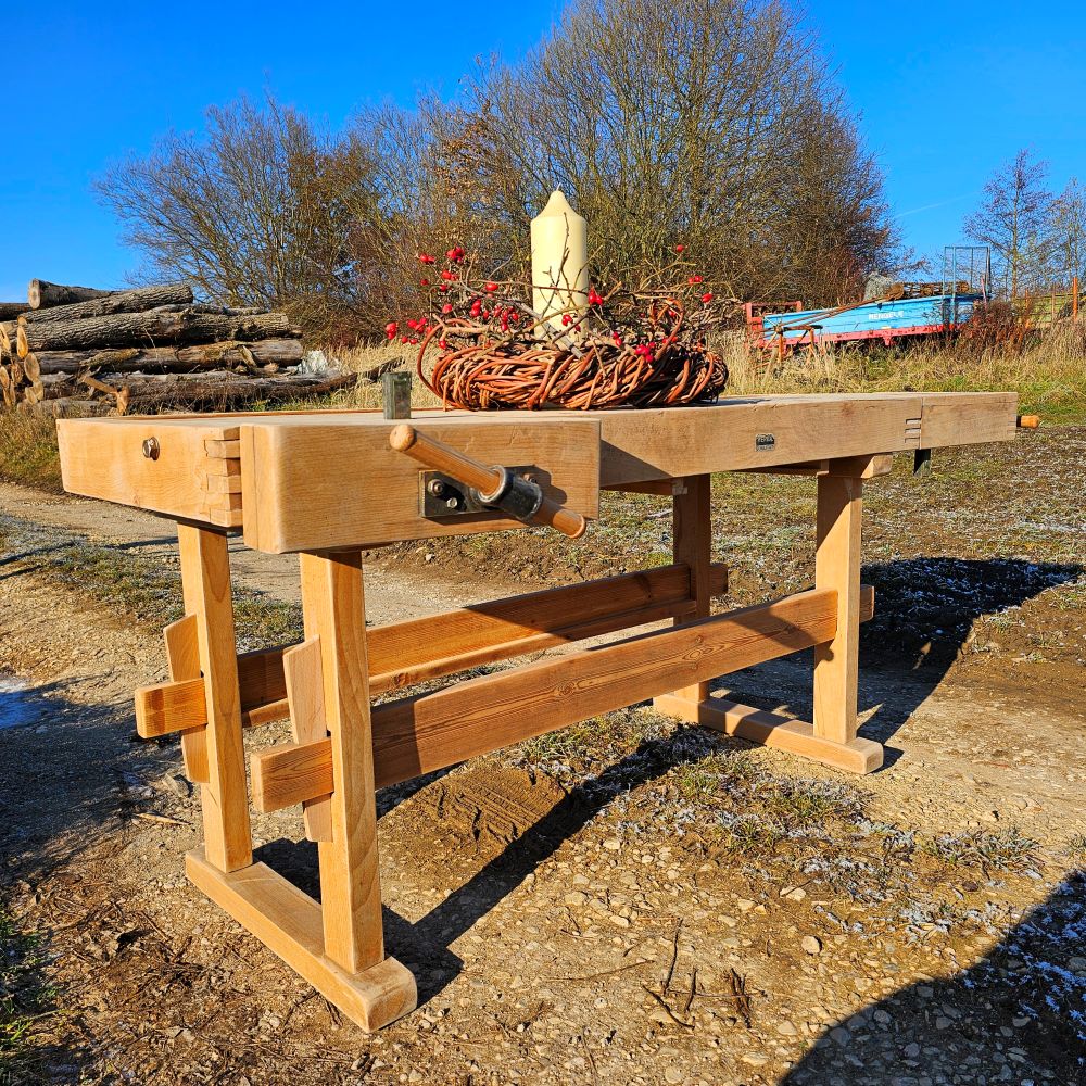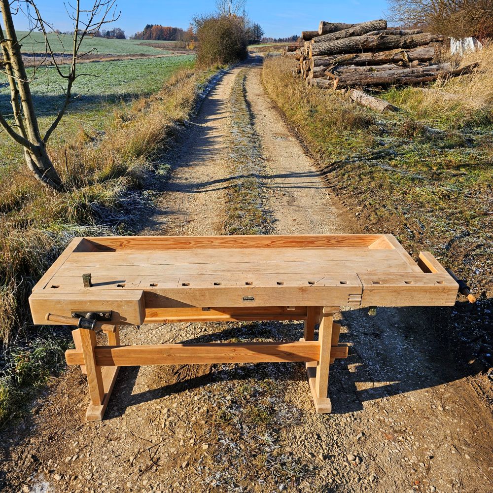 Behutsam aufgearbeitet: Holzoberflächen gereinigt und gefestigt, beide Schraubstöcke geprüft, Gestell stabilisiert. Authentische Gebrauchsspuren bleiben bewusst erhalten – sie machen den Charakter aus.