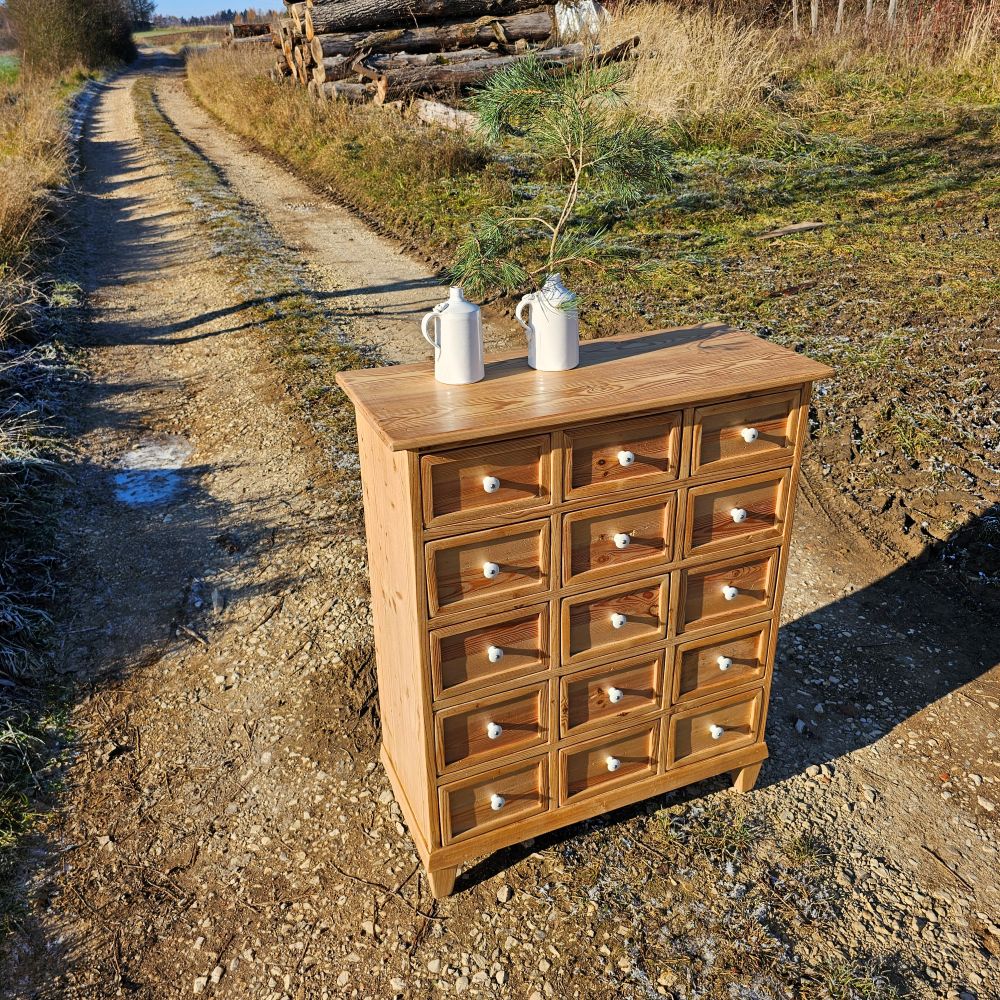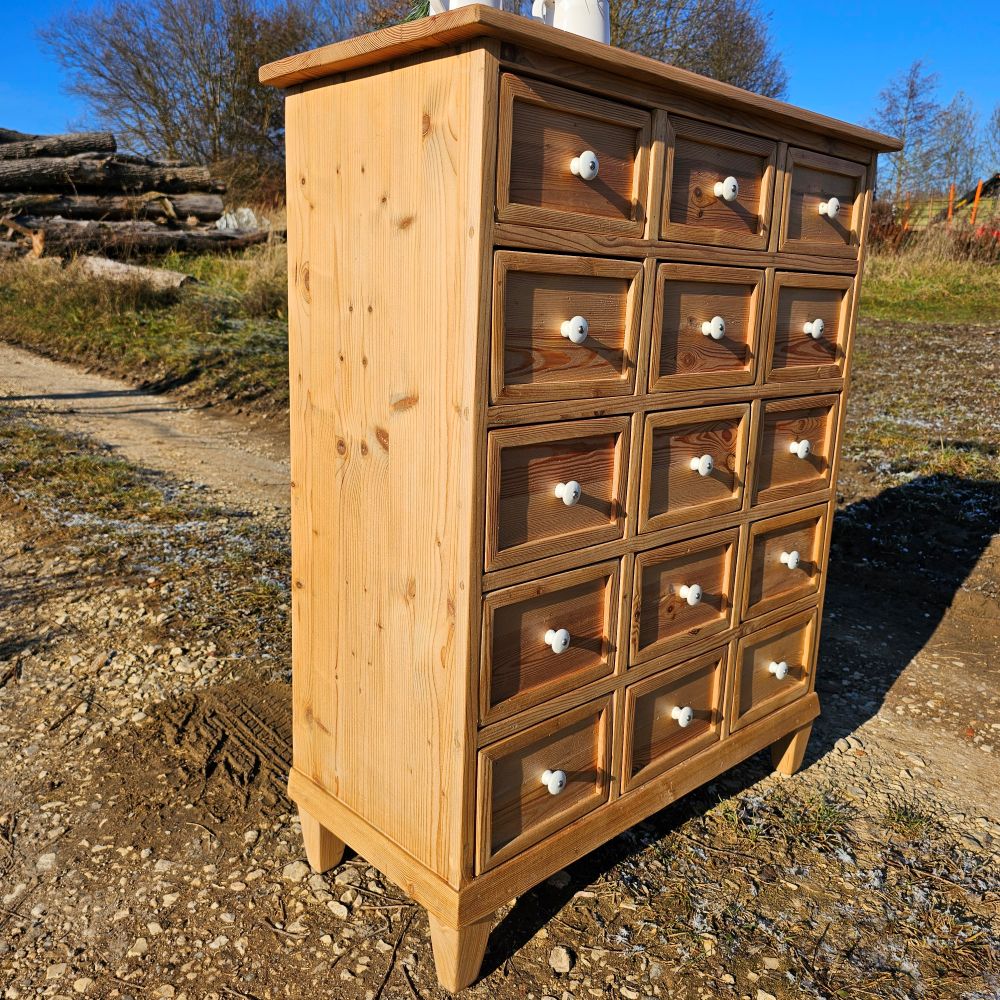 Ein Schmuckstück ist er geworden – dieser hübsche Apothekerschrank mit 15 Schubladen. Sein warmes Fichtenholz, die originalen Porzellangriffe geben ihm genau den Charme, den man an alten Stücken liebt. Ruhig in der Form, freundlich im Ton – ein Möbel, das man sofort gern hat.