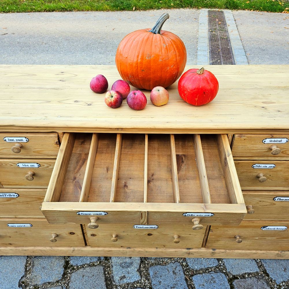 Als Ladentheke, Sideboard im Wohn-/Essbereich oder Organizer im Atelier: das Stück kombiniert sich hervorragend mit Vintage, Retro & Landhaus und bringt in modernen Interiors wohltuende Wärme. Mehr entdecken: Apothekerschränke & Vitrinen · Kommoden & Sideboards · alle Einzelstücke.