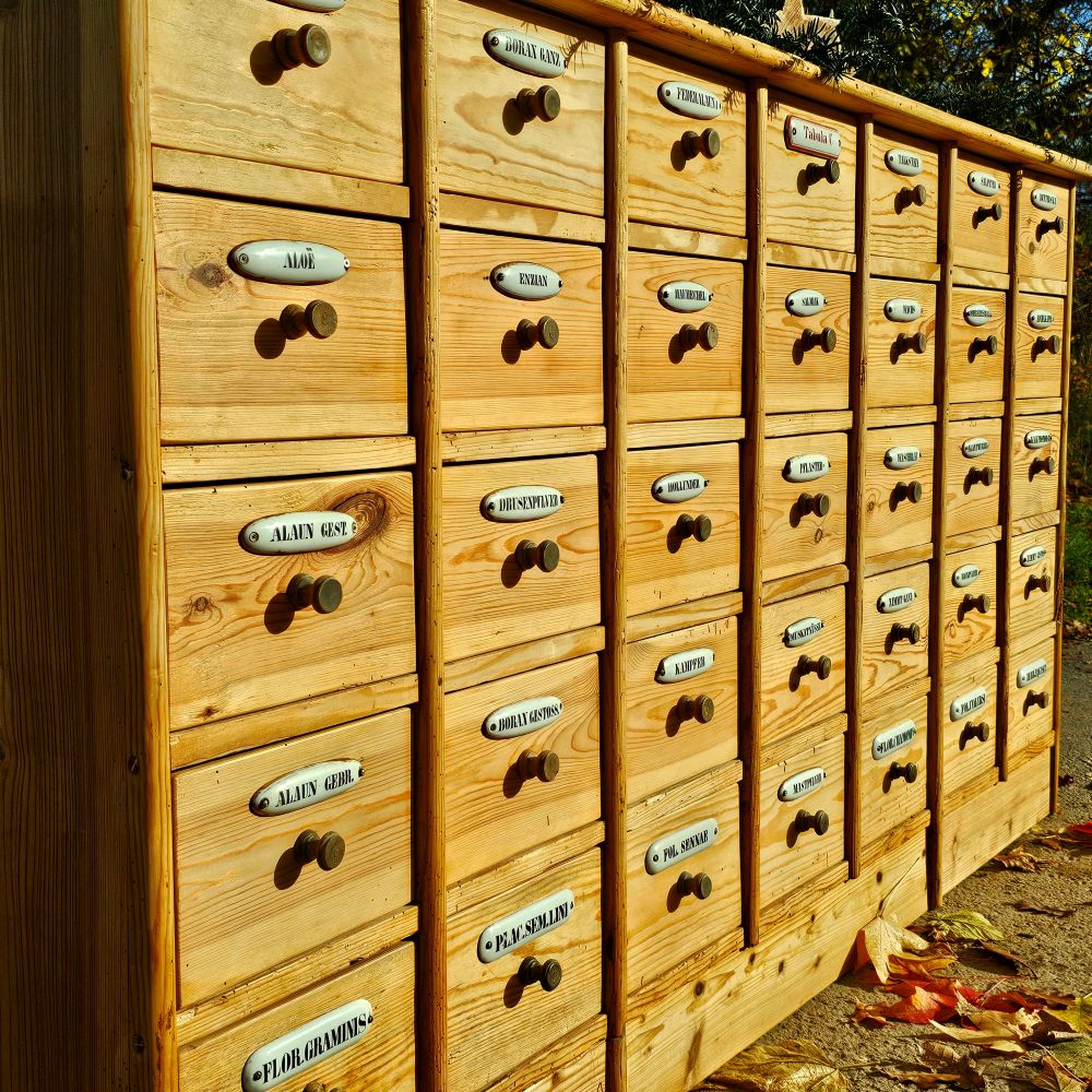 Alter antiker Apothekerschrank Schubladenschrank Ladentheke mit Porzellanschildern - 283
