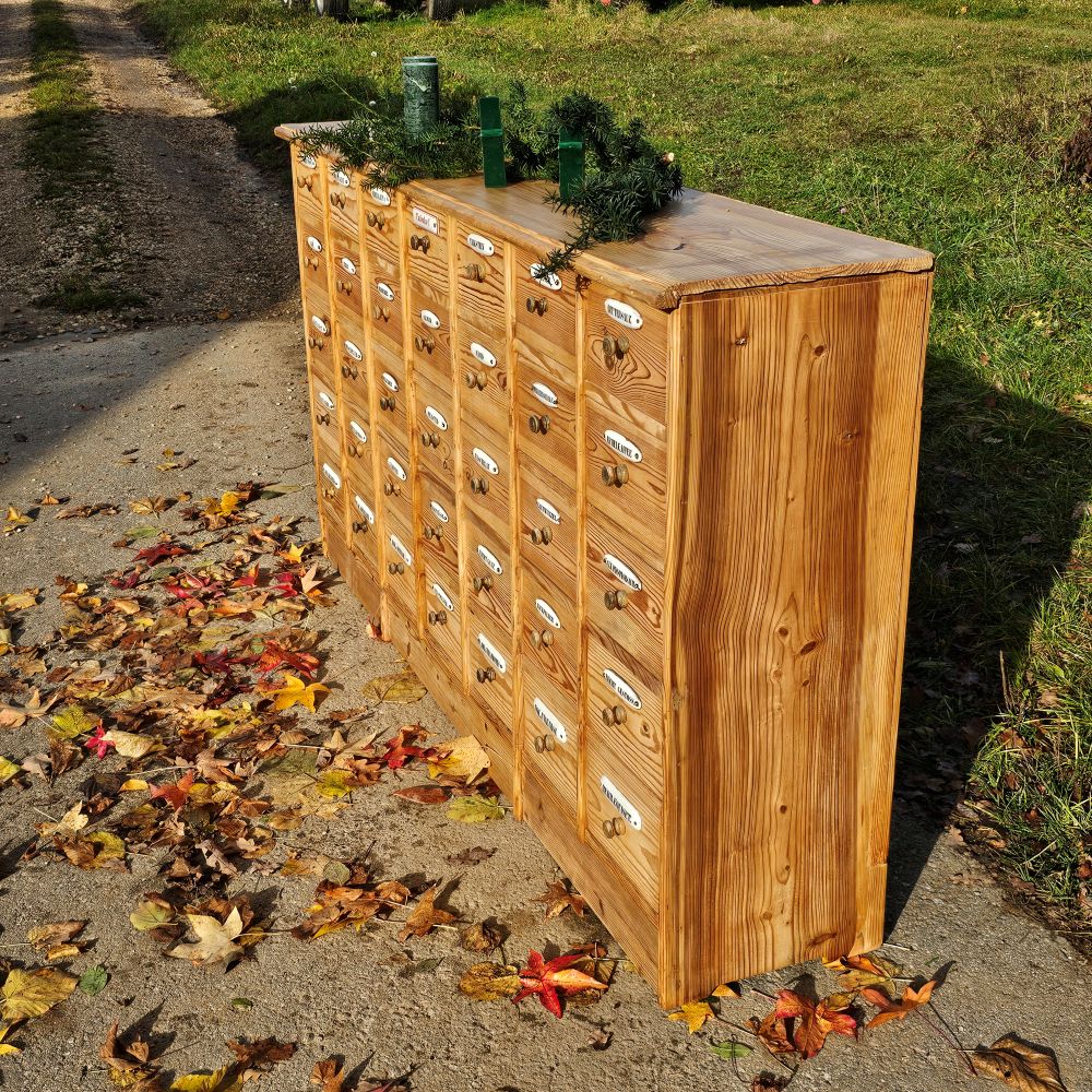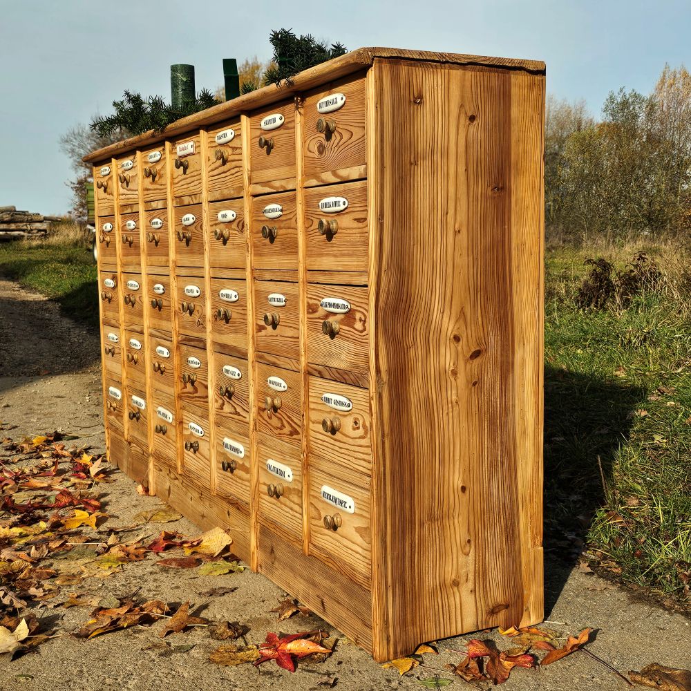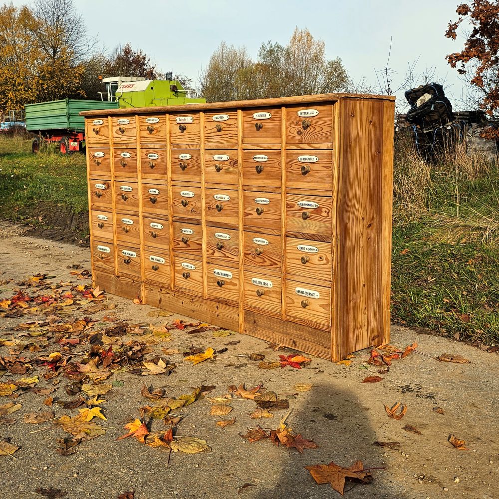 Er besticht mit seiner Individualität: Dieser original antike Apothekerschrank hat 35 Schubläden, was ihn unglaublich praktisch macht und viele Möglichkeiten zur Ordnung bietet. Er hat den rustikalen Chic des Alters und wenn er Geschichten erzählen könnte, würden wir ihm wahrscheinlich gefesselt zuhören. Jetzt will er sich zur Ruhe setzen und sucht ein gemütliches Zuhause – im Flur, um die Gäste zu begrüßen, im Esszimmer, um dort Gesellschaft zu leisten, oder im Wohnzimmer, um zur Gemütlichkeit beizutragen - er fühlt sich überall wohl. Handwerklich restauriert, naturbelassen gewachst – Holz, das man sehen und fühlen möchte.