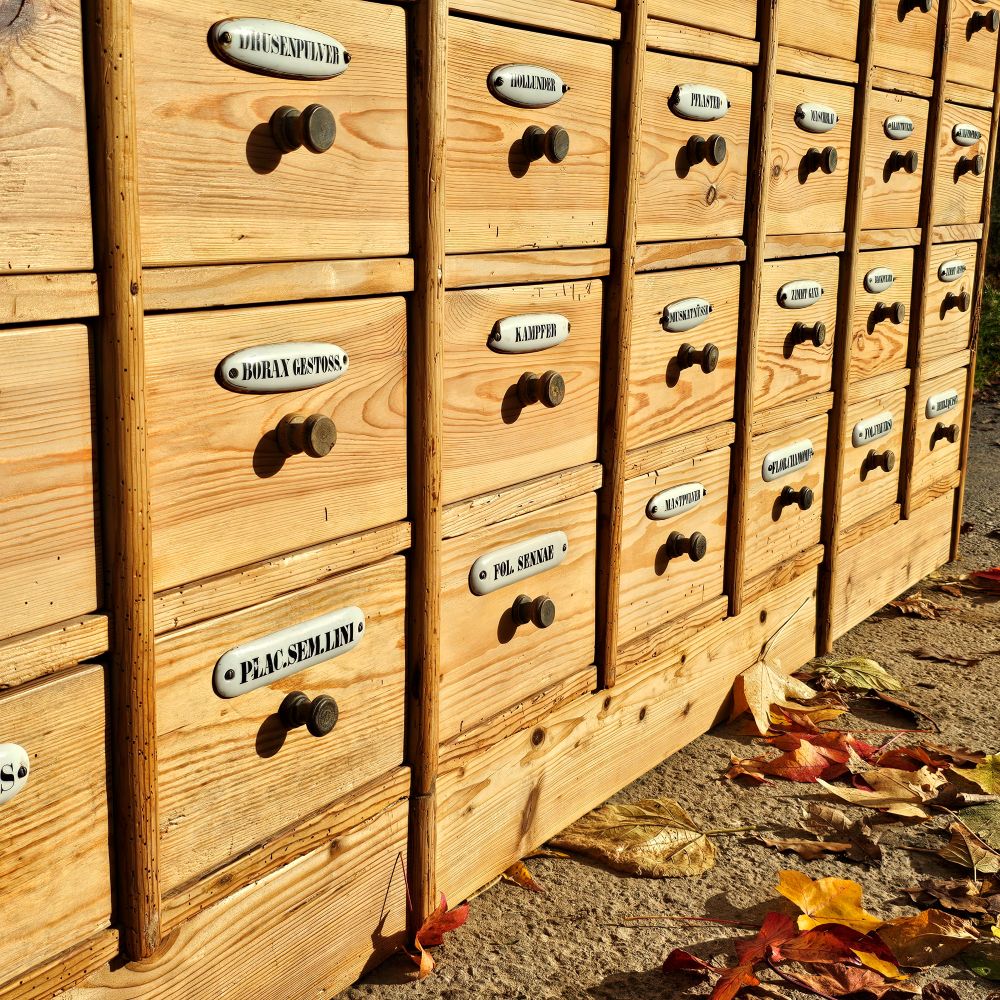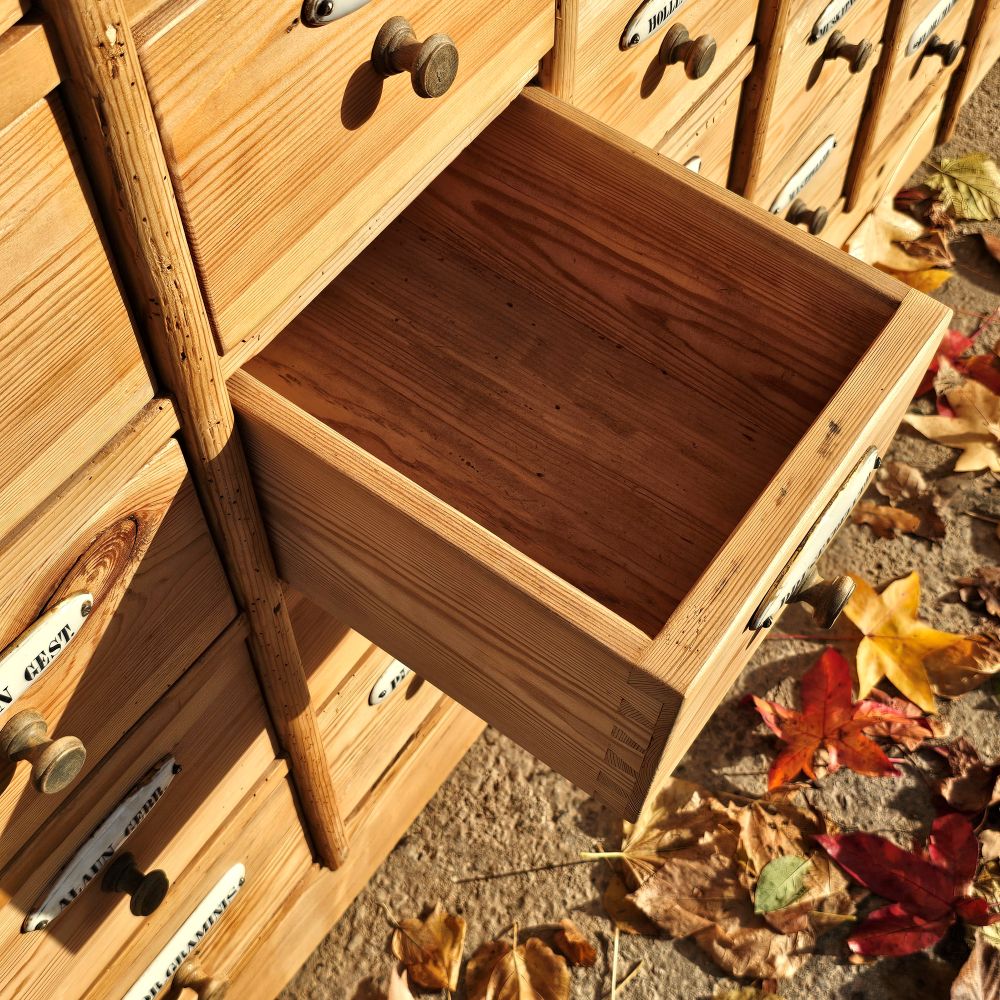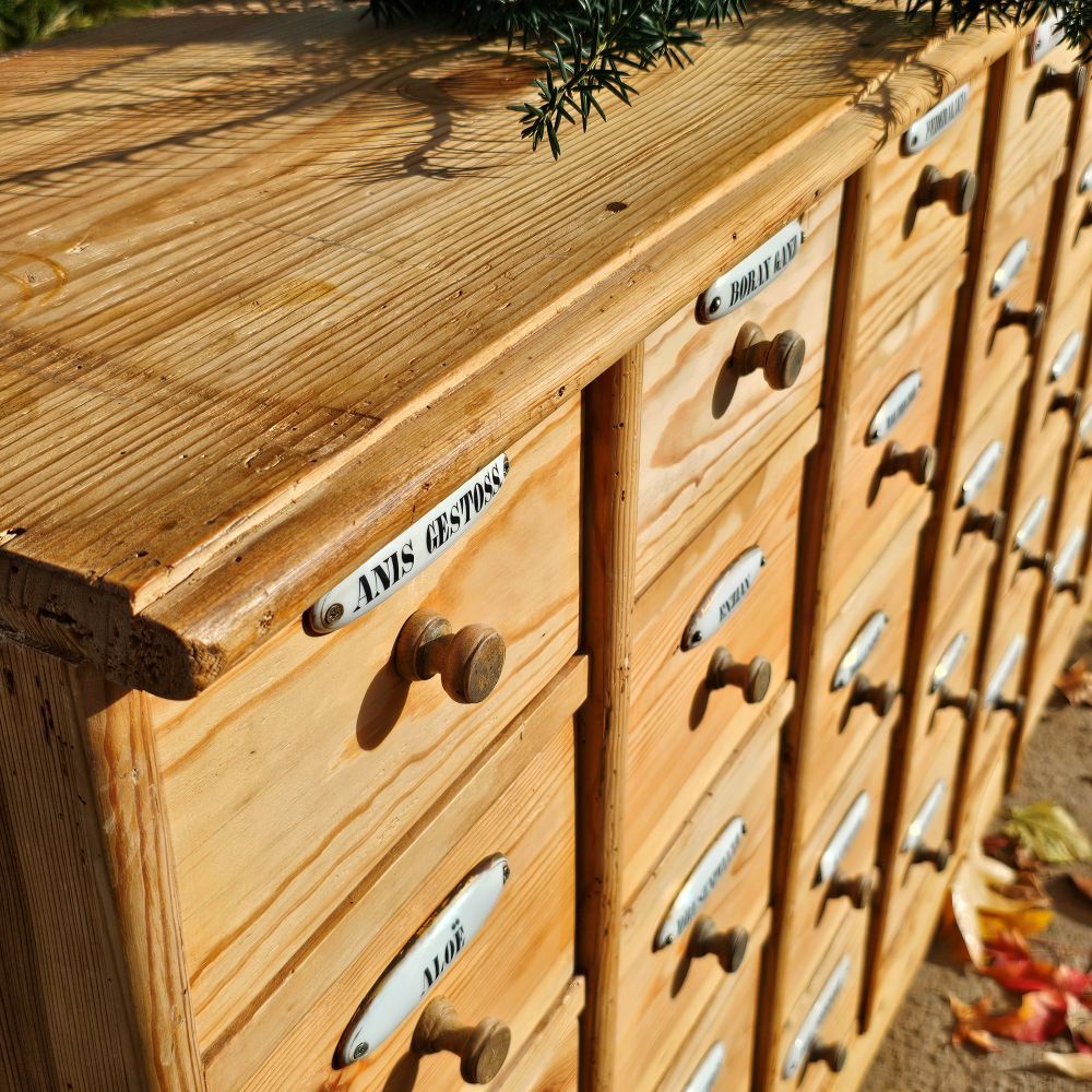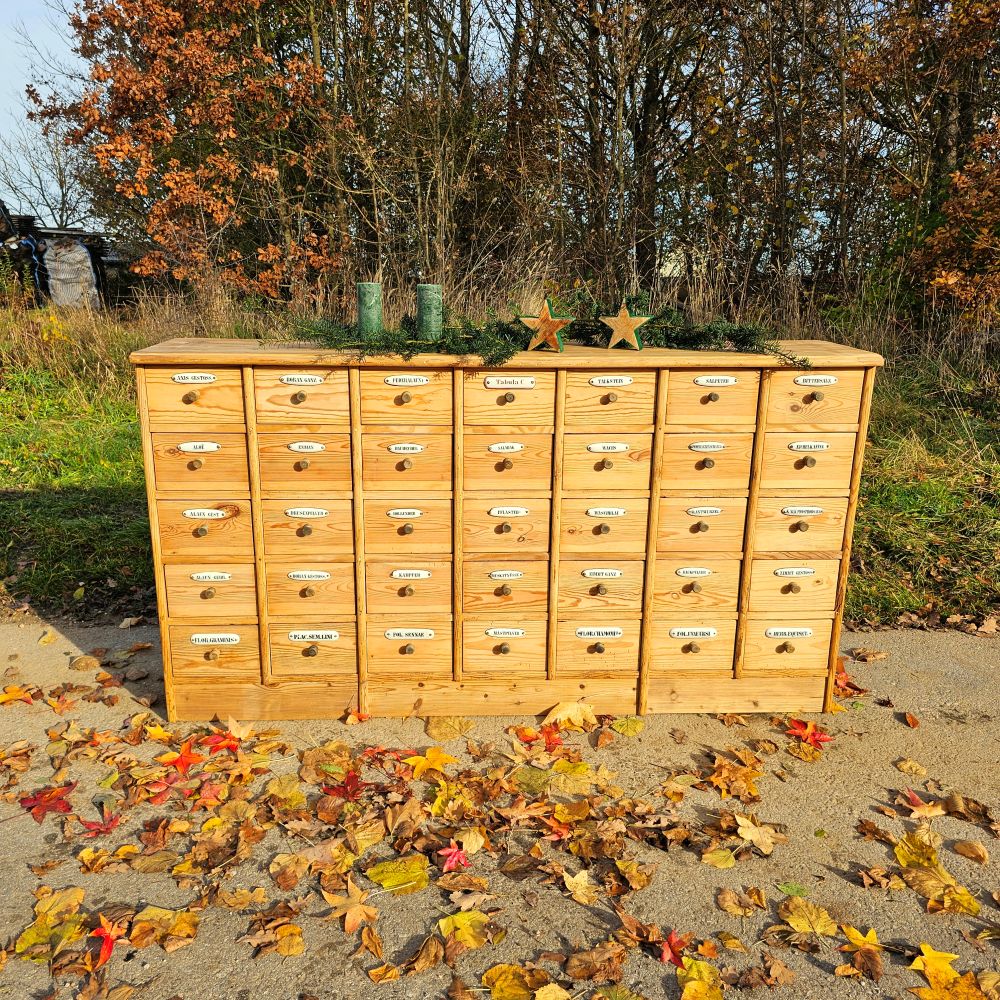 Er besticht mit seiner Individualität: Dieser original antike Apothekerschrank hat 35 Schubläden, was ihn unglaublich praktisch macht und viele Möglichkeiten zur Ordnung bietet. Er hat den rustikalen Chic des Alters und wenn er Geschichten erzählen könnte, würden wir ihm wahrscheinlich gefesselt zuhören. Jetzt will er sich zur Ruhe setzen und sucht ein gemütliches Zuhause – im Flur, um die Gäste zu begrüßen, im Esszimmer, um dort Gesellschaft zu leisten, oder im Wohnzimmer, um zur Gemütlichkeit beizutragen - er fühlt sich überall wohl. Handwerklich restauriert, naturbelassen gewachst – Holz, das man sehen und fühlen möchte.