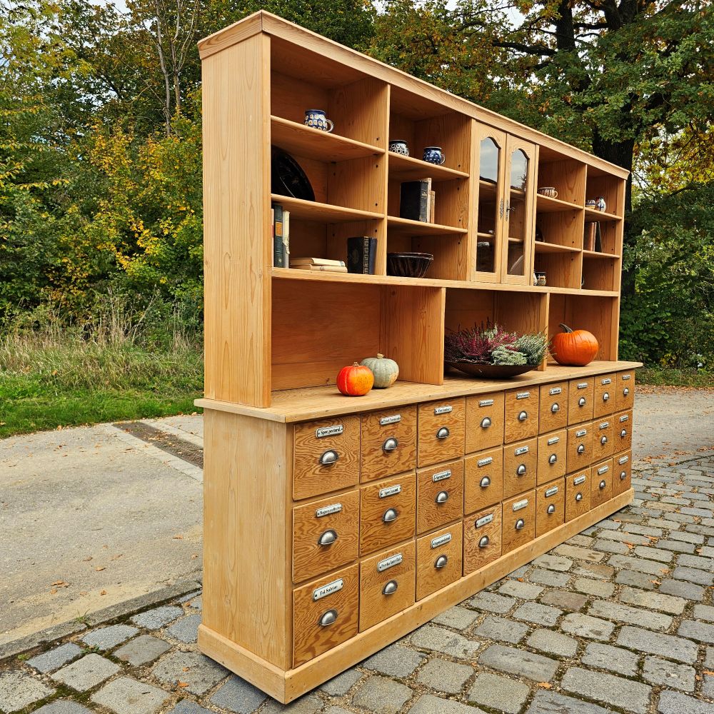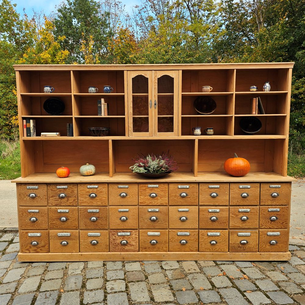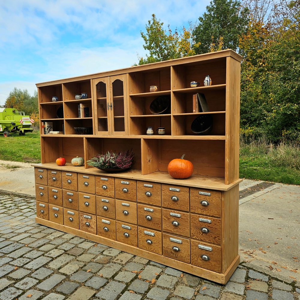 Alter antiker großer Schubladenschrank Ladenschrank Apothekerschrank mit Regalaufsatz und Emaille Schildern - 271