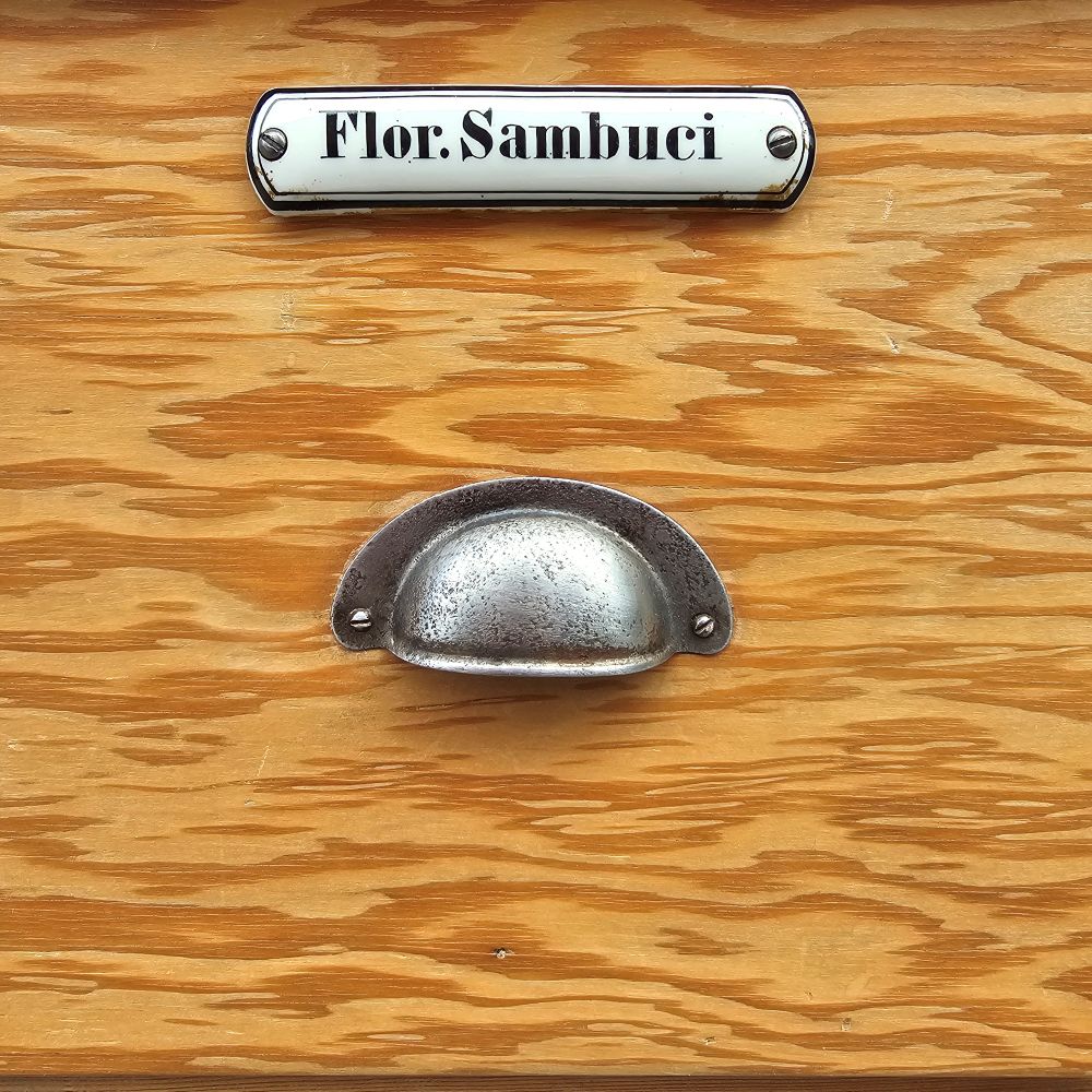 - Anzahl Schubladen: 27 mit Emaille-Schildern; Muschelgriffe