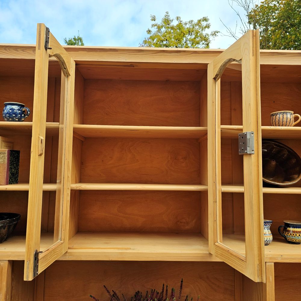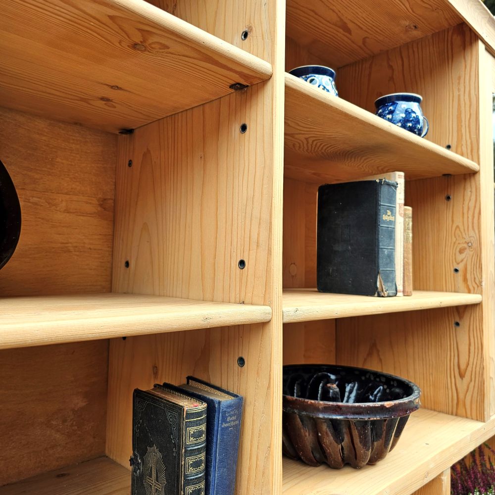 Behutsam restauriert, Holz natur gewachst, funktionsgeprüft. Das Ensemble ist teilbar – der Transport wird damit erheblich leichter. Ein charakterstarkes Einzelstück für Laden, Studio oder Zuhause. Abholung ist jederzeit möglich.