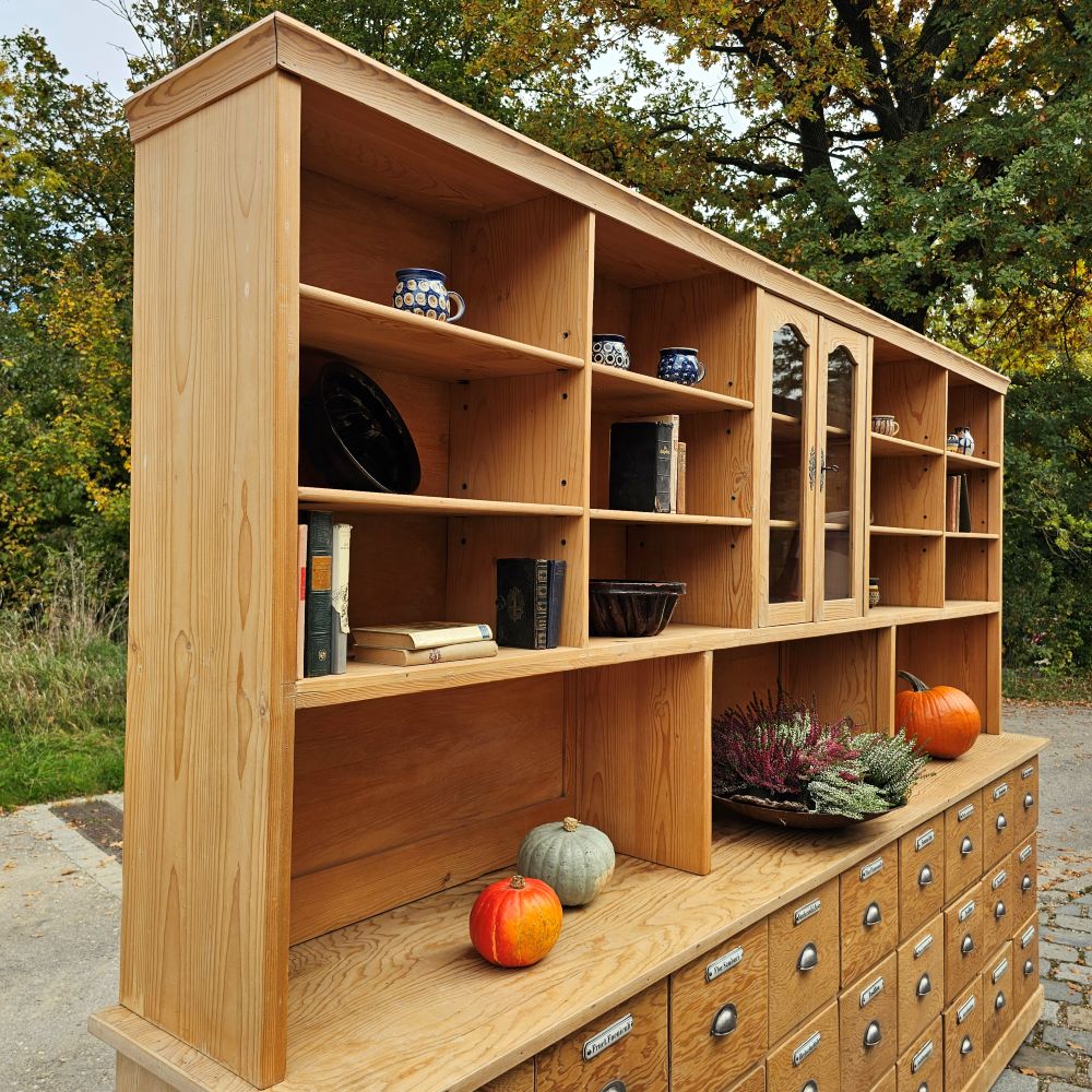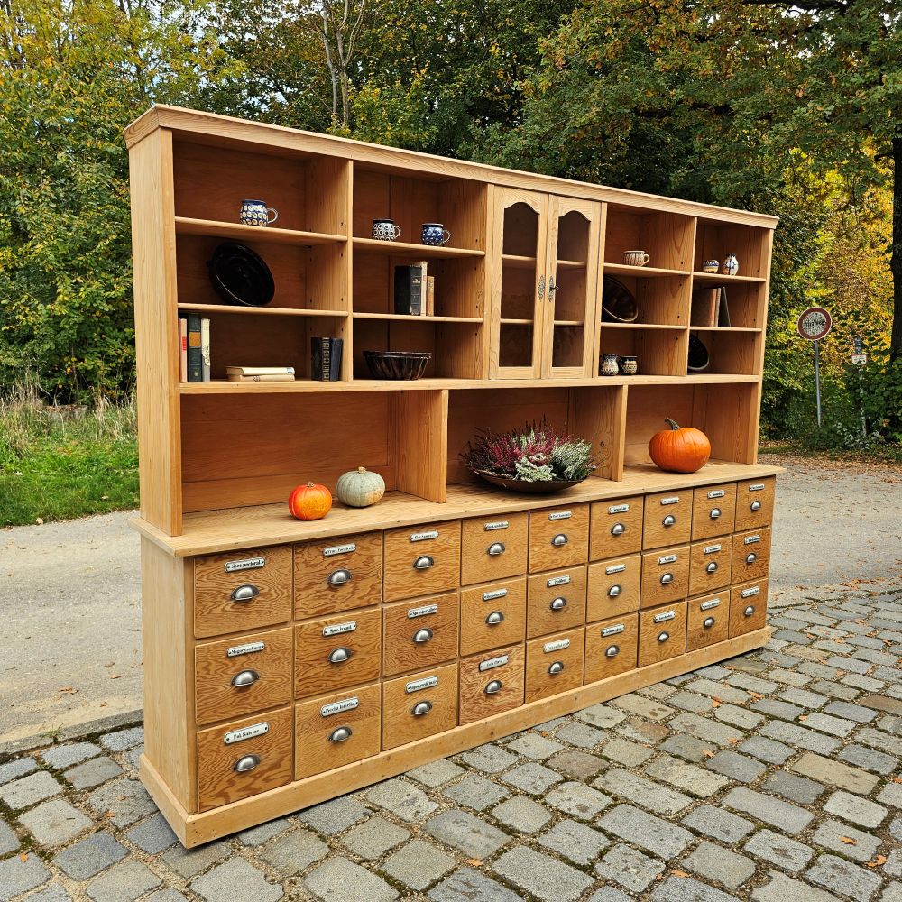 Ideal als Apothekerschrank im Wohnbereich, Sideboard mit Aufsatz im Esszimmer oder repräsentatives Stauraum-Möbel in Praxis, Atelier & Showroom. Harmoniert mit Vintage, Klassik & Landhaus und setzt in modernen Räumen einen warmen Gegenpol. Mehr entdecken: Apothekerschränke · Kommoden & Sideboards · alle Einzelstücke.