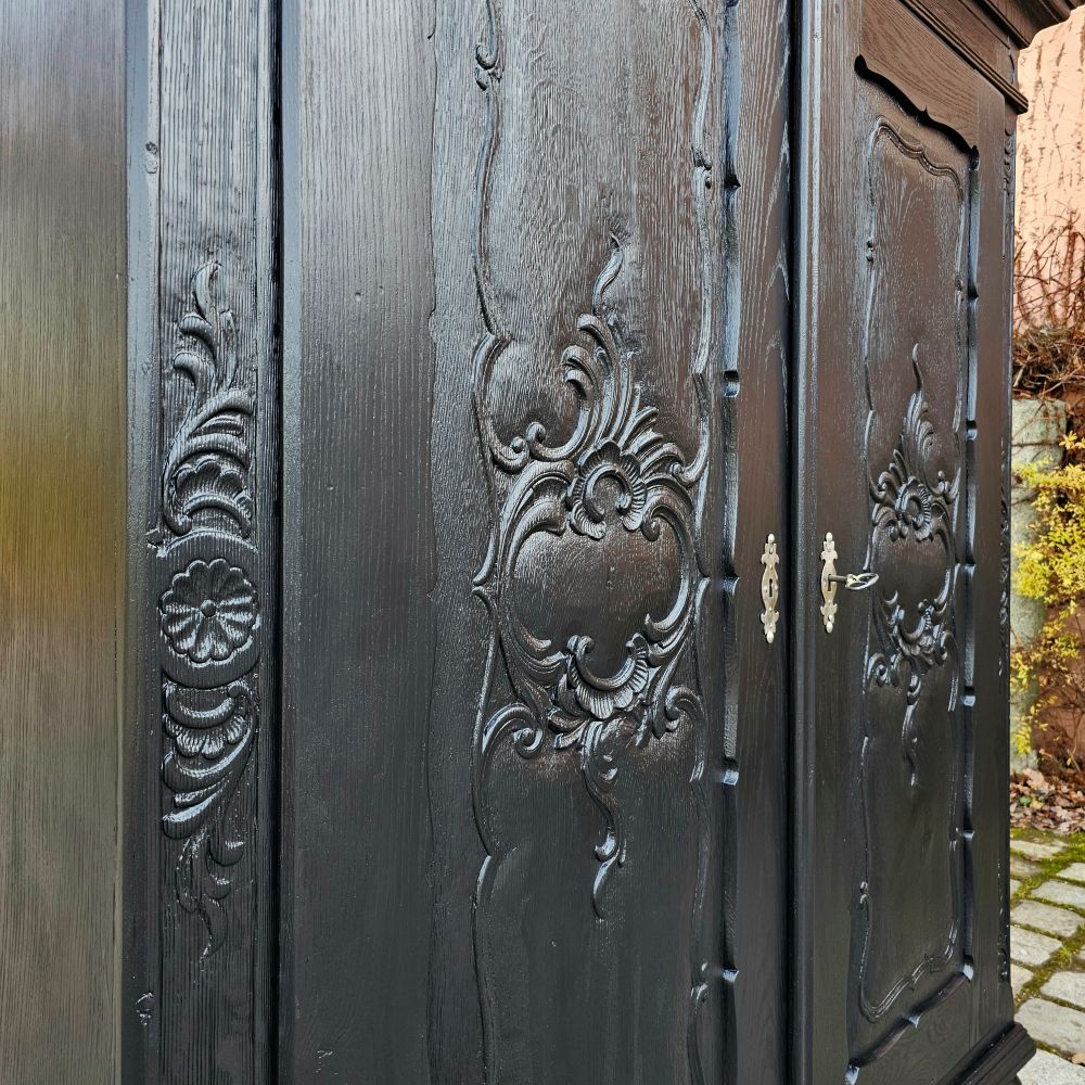 Alter, antiker Schrank fachgerecht restauriert und wohnfertig überarbeitet. Seine wunderschönen Schnitzereien kommen durch das Schwarz wunderschön zur Geltung. Seine Erscheinung repräsentiert die Eleganz vergangener mondäner Zeiten und bewahrt sie zugleich mit seinem Auftreten. Wertig gearbeitet aus Eiche Massivholz.