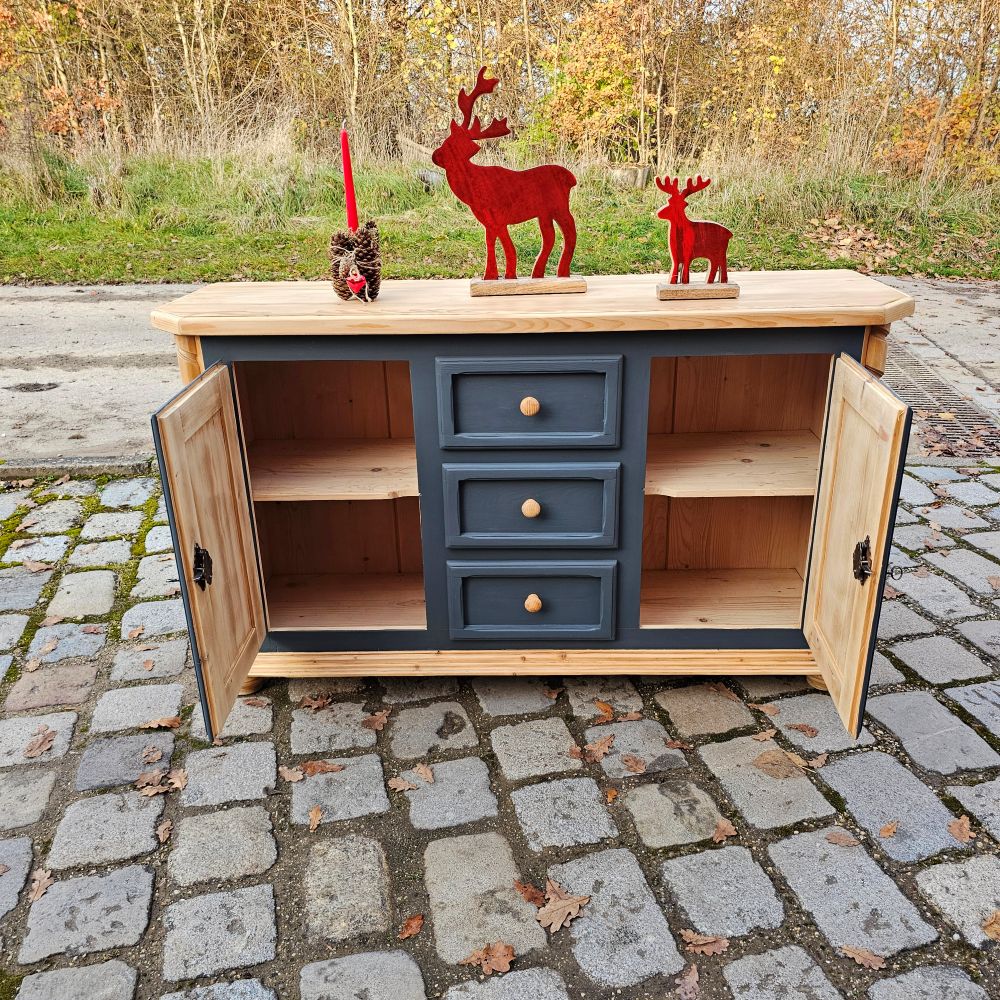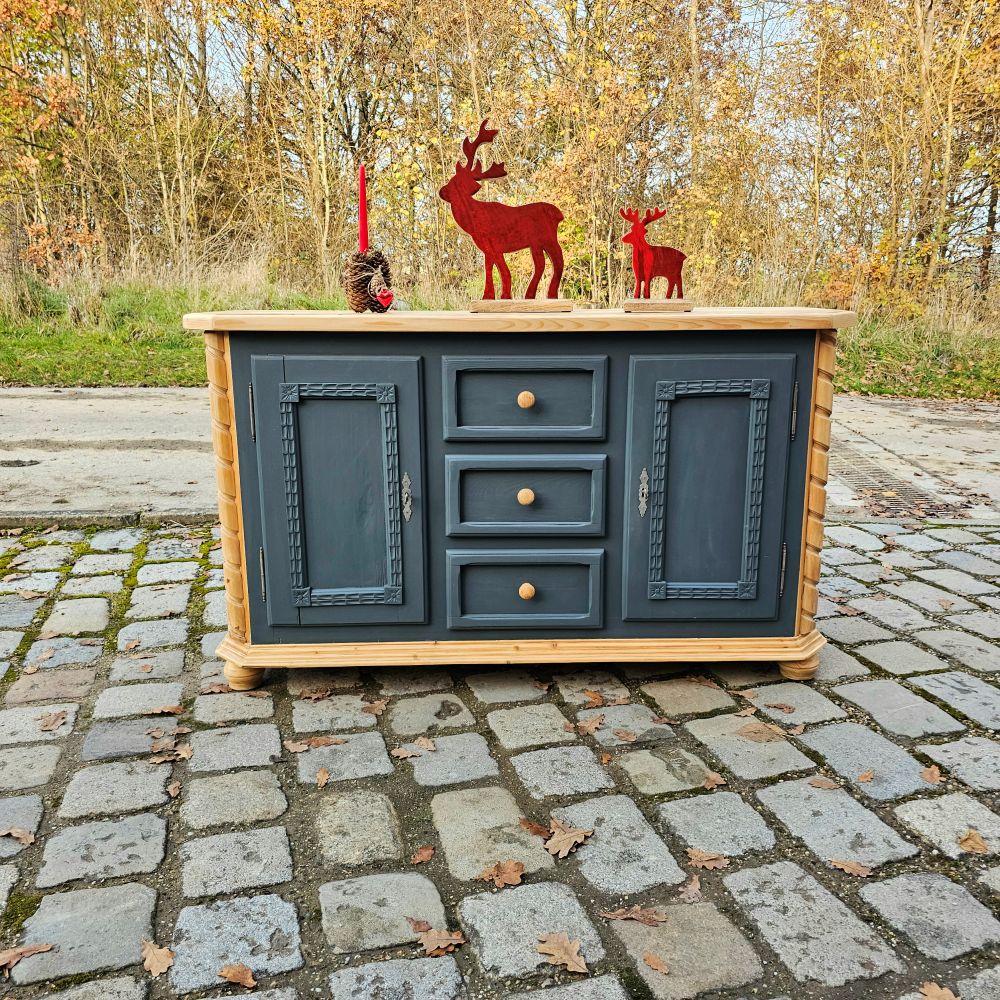 Fachgerechte Überarbeitung: Oberfläche vorbereitet und neu lackiert, Struktur geprüft und stabilisiert, Türen/Schubladen eingestellt. Kleine, altersbedingte Spuren bleiben sichtbar – volle Alltagstauglichkeit.