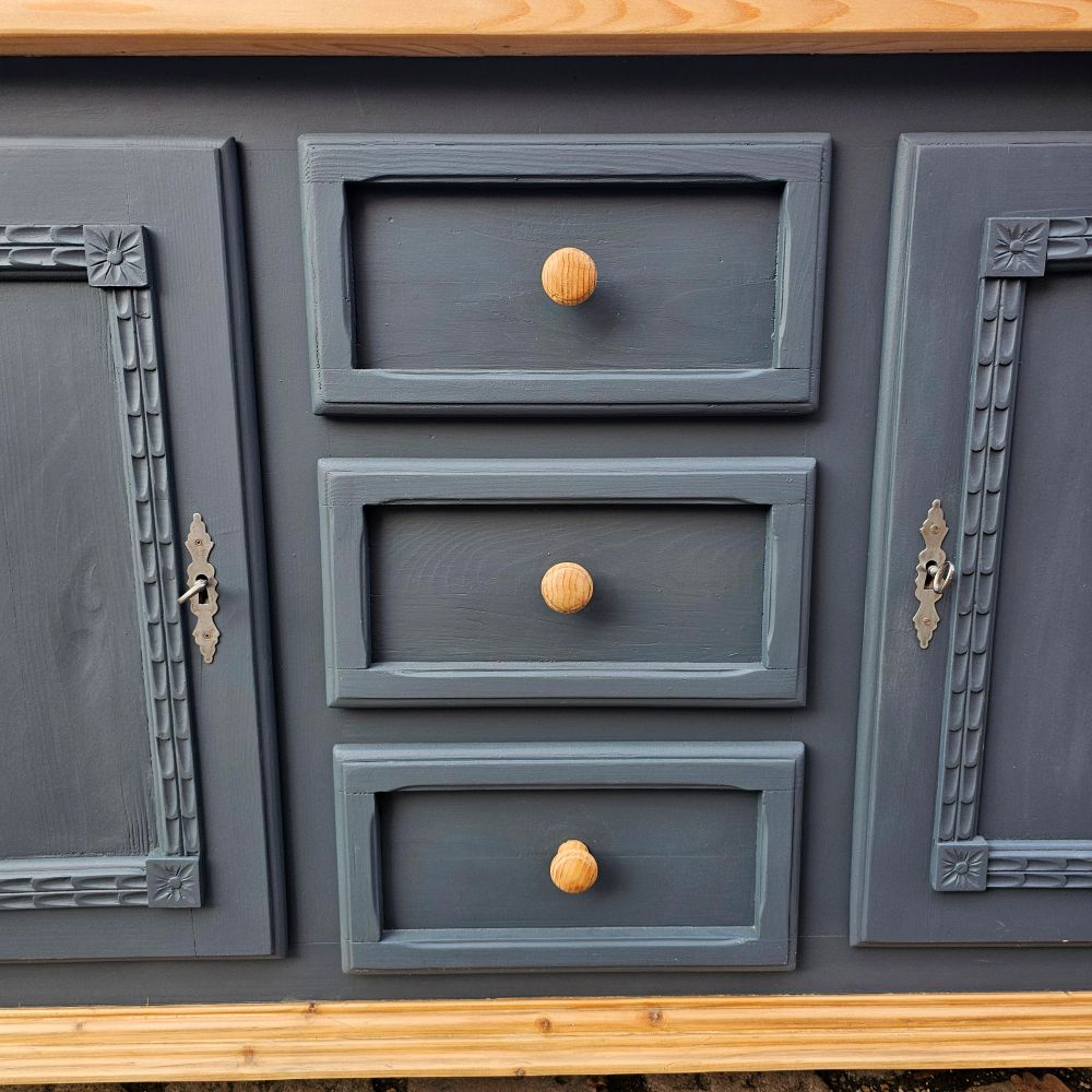 Vintage Kommode / Schubladenschrank / Anrichte, in unserer Werkstatt sorgfältig restauriert und teilweise neu lackiert. Das Stück verbindet alte Substanz mit frischem Auftritt – robust im Alltag, dekorativ im Raum. Sie hat schöne Verzierungen, ein äußerst dekoratives, wie praktisches Möbelstück.