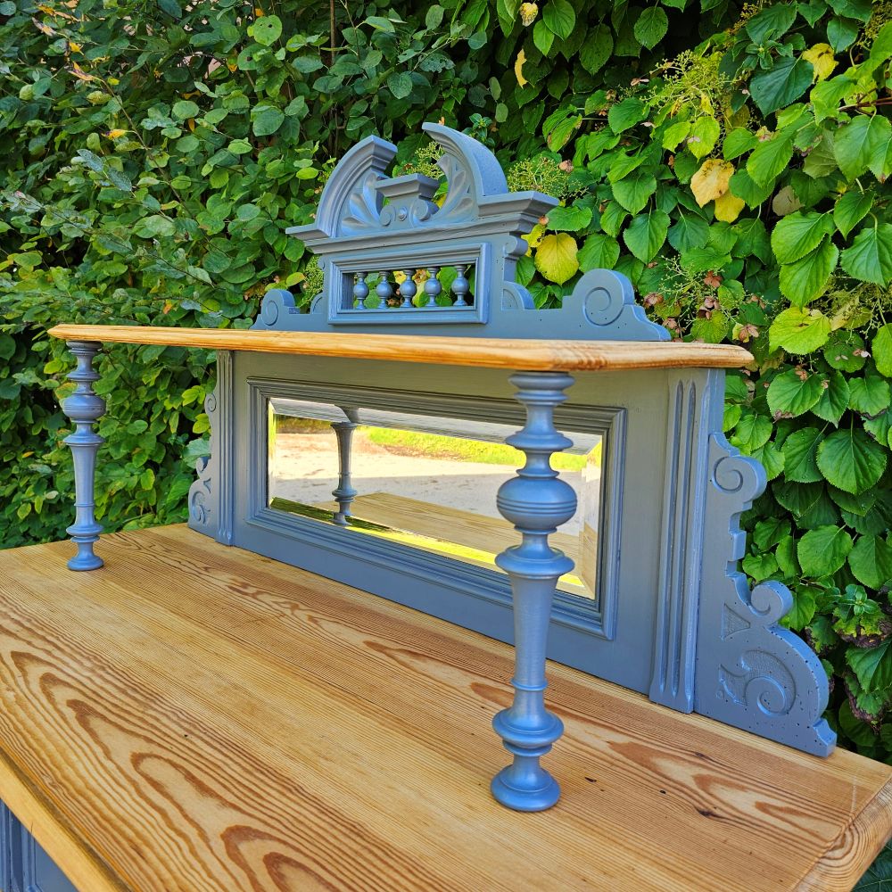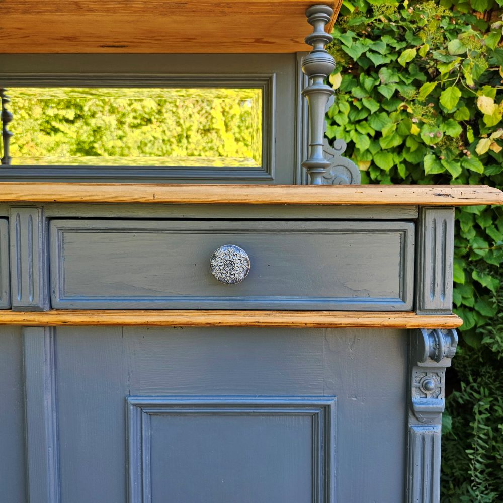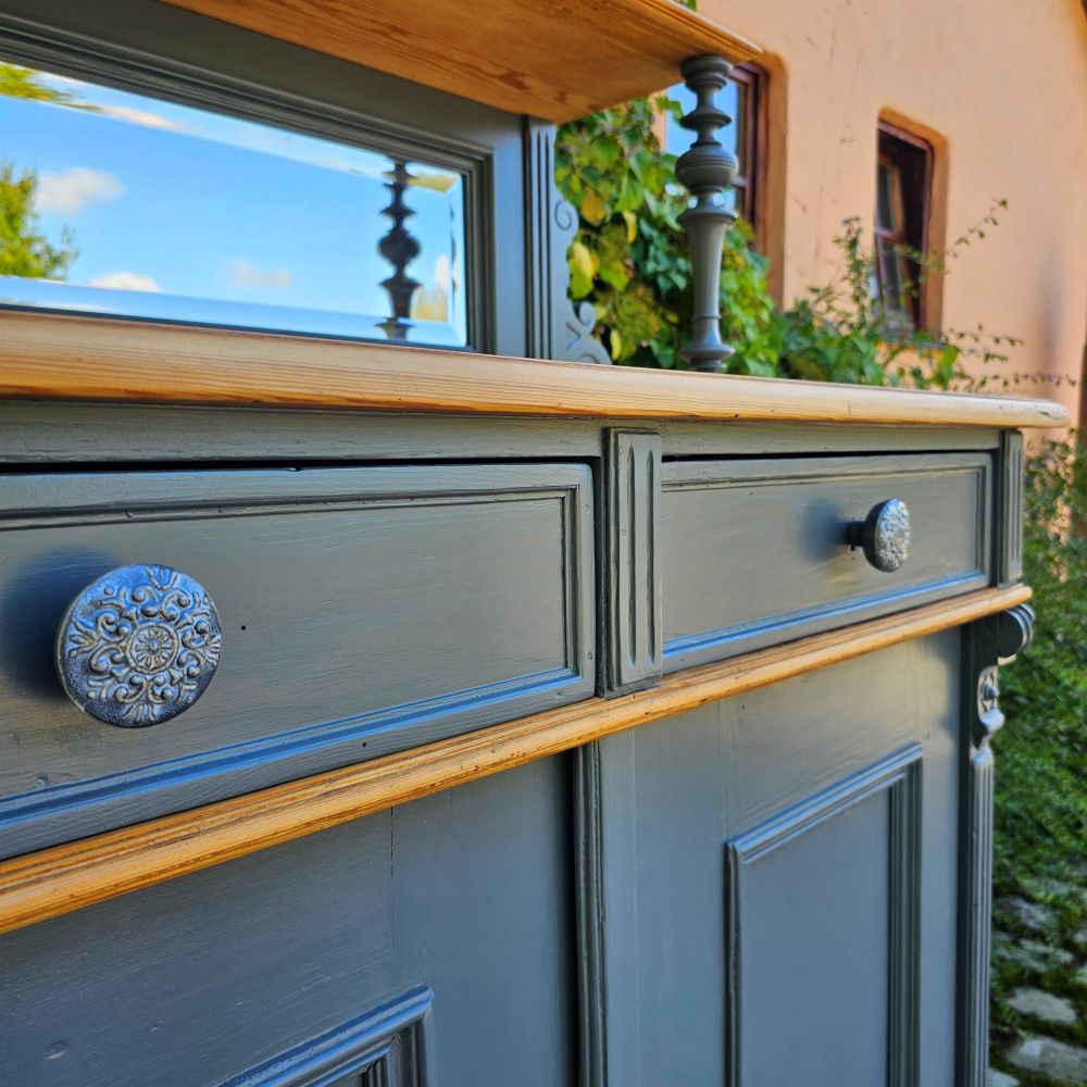 Ein beeindruckendes Stück Möbelgeschichte: dieses Vertiko mit Spiegelaufsatz aus Weichholz verbindet nostalgische Eleganz mit Funktionalität. Der Spiegel-Aufsatz oben und die neue Teillackierung in angenehmem grau verleihen ihm Charakter und Stil. Er wirkt wie gemacht, um sowohl in traditionellen, als auch modernen Räumen ein Statement zu setzen – ein Möbelstück, das auffällt und zugleich äußerst funktional ist.