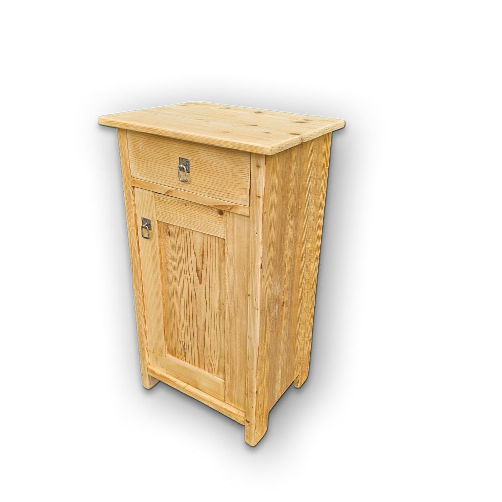 Ein Klassiker mit Ruhe und Charme: Dieses alte Nachtkästchen aus Fichte besticht durch sein schlichtes, geradliniges Design und die eleganten Schlaufengriffe aus Messing. Es ist ein Stück, das Wärme schafft – besonders gut geeignet, wenn man geschickt kleine Freude in den Alltag bringen will.