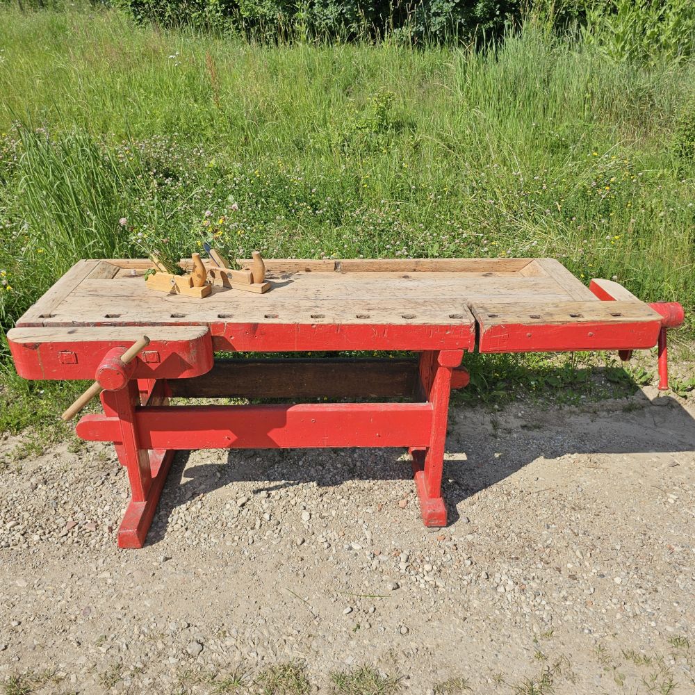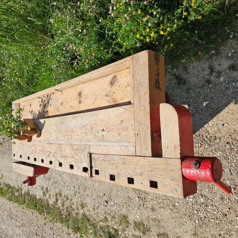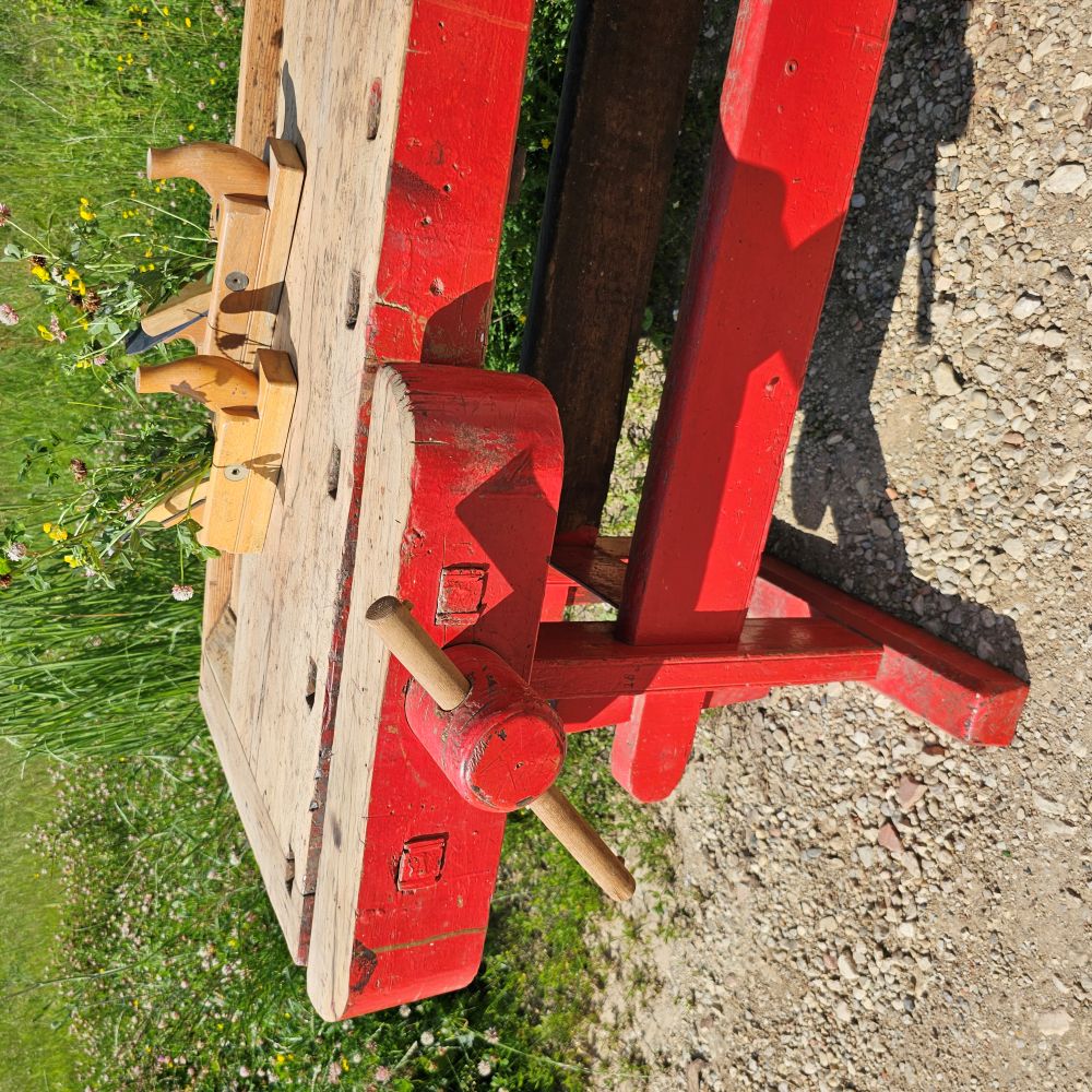 Behutsam aufgearbeitet: Holzoberflächen gereinigt und gefestigt, beide Schraubstöcke geprüft, Gestell stabilisiert. Authentische Gebrauchsspuren bleiben bewusst erhalten – sie machen den Charakter aus.